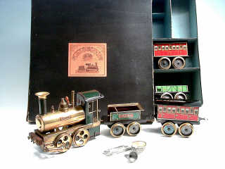 écartement III - chauffage à esprit-de-vin - locomotive en cuivre & tôle lithographiée, complète avec ses accessoires & son entonnoir - tender E.P. n° 1866 (correspondant à l'année de création de la firme allemande), wagon tombereau & 2 voitures voyageurs - pour la petite histoire, ce coffret est resté près d'un siècle dans l'arrière boutique d'un ancien magasin de jouets qui a cessé son activité dans les années 60 - l'exploitant n'a jamais mis ce coffret en vente étant donné qu'il l'avait reçu sans les rails, et qu'il n'a jamais pu les obtenir - ce coffret sera donc vendu pour la première fois ! - ETAT REMARQUABLE & EXCEPTIONNEL POUR CE MAGNIFIQUE ENSEMBLE !