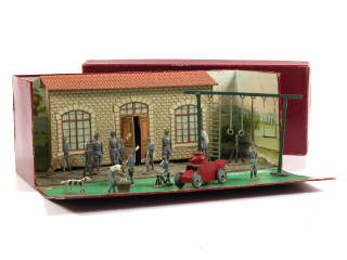 comprend : 12 soldats, un chien, 2 ensembles de 3 fusils, un portique de différentes activités sportives & un bâtiment en carton imprimé - fabrication ancienne en demi-rond de bosse - petites traces d'oxydation sur le portique - petits manques sur un soldat - on y joint un char de la marque AR en état 'C'