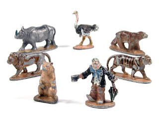 comprend : un rhinocéros, une autruche, un ours assis, un lion, un ours marchant, un tigre & le clown AUGUSTE