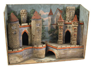 dimensions déplié : 60 x 16 x 43 cm - en bois peint & carton bouilli - fabrication début XXème siècle - manque rabat - quelques taches & fêlures