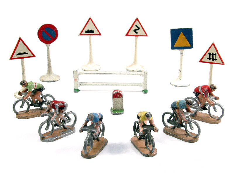 états de 'C' à 'E' - comprend : un cycliste suisse, un coureur avec maillot vert, un avec maillot jaune, un avec maillot rouge & 2 autres avec maillot bleu - on y joint une barrière & une borne kilométrique - un panneau en état 'B'