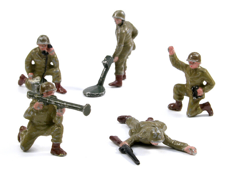 comprend : un officier à genoux avec des jumelles, un téléphoniste avec son poste, un bazooka à genoux, un démineur avec son détecteur à métaux & un soldat allongé