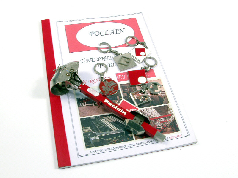 comprend 5 porte-clefs & une pince à glaçons (en état 'C') - on y joint un fascicule détaillant les différents objets publicitaires & les jouets se rapportant à la marque POCLAIN & réalisé par BERNARD DIOT