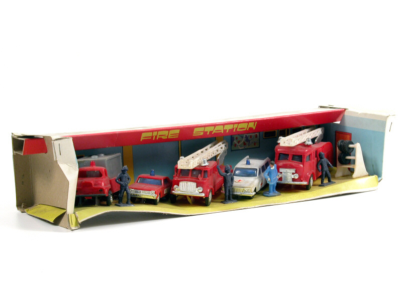 contient : 3 camions de pompiers, un voiture du chef des pompiers, une ambulance, 4 figurines & un rack de pneus - manque une calandre sur un modèle