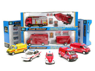 HONGWELL (CHINE) 350/1112 MERCEDES Fourgon de pompiers 'BRANDWEER' avec remorque & zodiac rouge