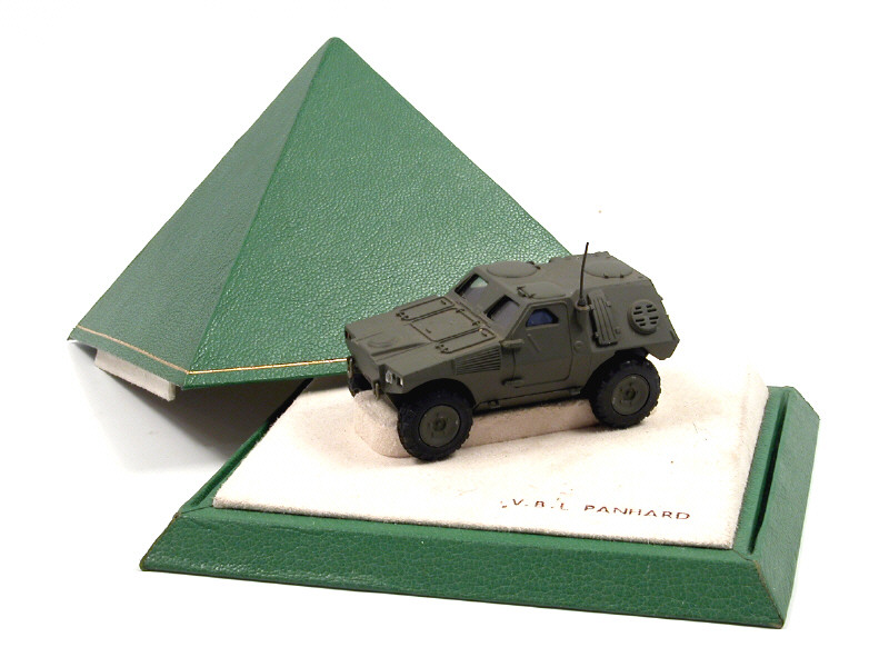 ce coffret-cadeau en forme de pyramide aurait été conçu pour être offert à des officiers à l'issue de réunions d'information & de démonstration - ce boîtage a probablement été réalisé pour 'séduire' des militaires étrangers afin d'exporter ce type de blindé - l'inscription V.B.L PANHARD est gravée sur le couvercle & sur le socle