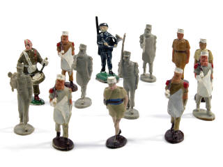 états de 'B' à 'D' - comprend 11 légionnaires & un chasseur au tambour - 4 figurines non peintes - on y joint un chasseur alpin de marque indéterminée - manque 4 extrémités de haches
