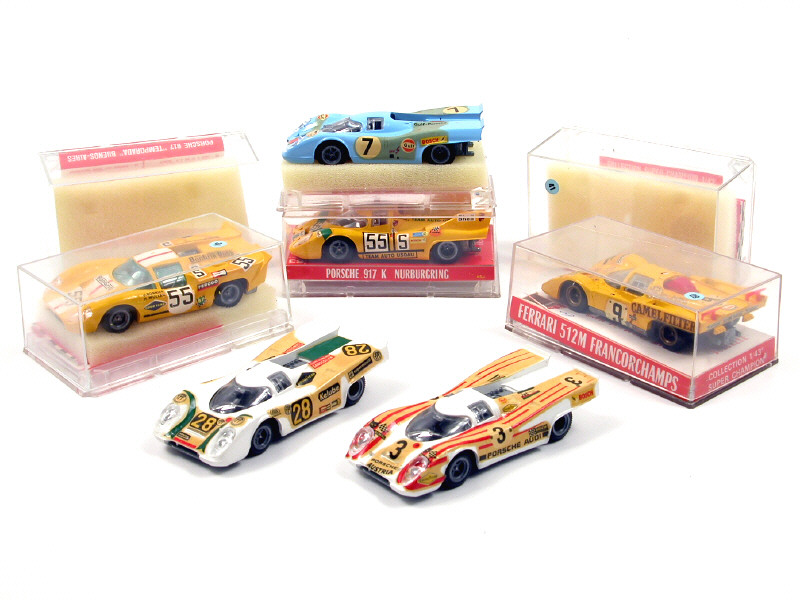 comprend : 4 PORSCHE 917, une FERRARI 512M & une LOLA T70 - avec 6 dépliants - 4 boîtes avec absence de socle carton