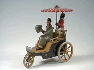 fabriqué vers 1894 - version avec parasol rouge rayé blanc - avec moteur à ressort (à revoir) - petite restauration du piquet du parasol - le véhicule en mouvement déclencle la rotation du parasol