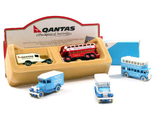 comprend : un coffret avec 2 utilitaires & un autobus réalisé pour la compagnie KLM, un autre comprenant un autobus & un utilitaire réalisé pour la compagnie australienne QANTAS