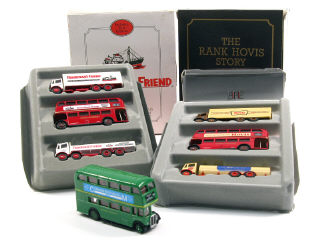 comprend : un coffret avec 2 utilitaires & un autobus réalisé pour la compagnie FISHERMAN & un coffret avec 2 utilitaires & un autobus réalisé pour la compagnie HOVIS - un autobus réalisé pour le BUS MUSEUM DE COBHAM