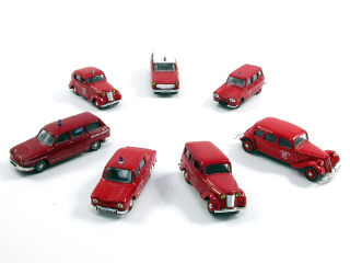 miniatures reproduisant les modèles : RENAULT, CITROËN, PANHARD & PEUGEOT - on y retrouve les marques : TEK-HOBY, NOREV & ELIGOR - pneus coupés sur un véhicule