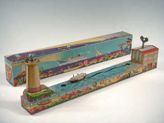 longueur 38 cm - moteur à clef (grippé) - sur un décor marseillais, le bateau sort du port, navigue jusqu'au phare, puis revire vers le point départ - phare électrique