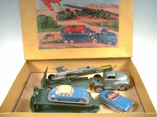 complet - dimensions du coffret 47 x 33 x 10 cm - contient : tracteur mécanique à clef (fonctionne), remorque lance-fusée, remorque porte-voitures avec une PORSCHE & une MERCEDES 190 SL - BELLE ILLUSTRATION !