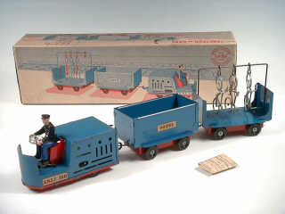 longueur 36 cm - moteur à clef (fonctionne avec avertisseur) - tracteur avec son conducteur, chariot 'POSTES' & chariot porte-vélos - clef dans son emballage - fabriqué en 1951 - ETAT EXCEPTIONNEL !