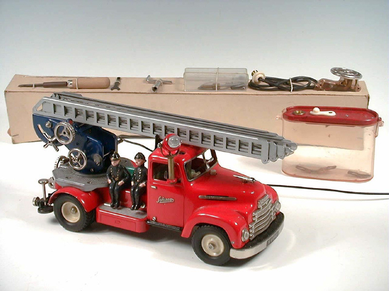 longueur 29 cm - moteur à piles (non testé) - boîtier & volant de filoguidage - accessoires & outillage - manque un pompier assis & couvercle de boîte - UNE MERVEILLE DE PRECISION & DE TECHNOLOGIE !