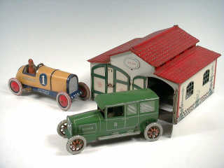 SUPERBE ENSEMBLE comprenant garage (16,5 x 15,5 cm) à deux portes double battants, SEDAN réf : 765 (14 cm) verte & GALOP réf : 760 (14 cm) jaune & noire - le mécanisme à ressort de chacune des automobiles fonctionne parfaitement - fabriqué de 1927 à 1941 - ETAT EXCEPTIONNEL !