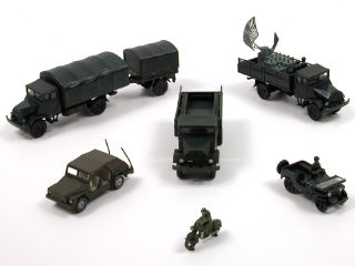 comprend : 2 camions transport de troupe dont un bâché avec remorque, un camion avec unité radar, une jeep & une VOLKSWAGEN 181 - on y joint une moto de marque indéterminée