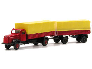 VILMER (DANEMARK) VOLVO N 88 Plateau à ridelles bâché avec remorque jaune & rouge