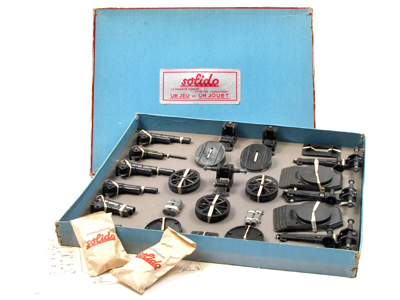 dimensions : 41 x 31 cm - contient différents éléments permettant la construction de canons - tous les éléments sont toujours ficelés sur le socle de présentation - avec 2 sachets d'accessoires & notice datée de 1949 - quelques petites traces d'humidité sur 4 éléments & un canon avec traces de métal fatigue