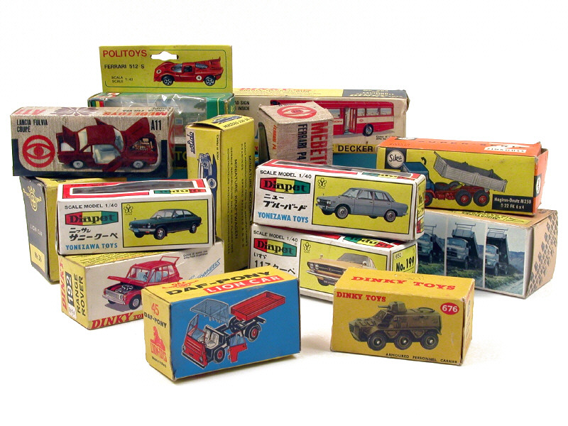 états de 'b' à 'd' - on y retrouve les marques : DINKY TOYS GB (références 192, 283 & 676), LION CAR (36 & 45), MEBETOYS (A11 & A27), SOLIDO (126), SIKU (V281), POLITOYS (E22), YONEZAWA DIAPET TOYS (171, 199 & 223) & une boîte de marque indéterminée (vraisemblablement NZG ou CONRAD)
