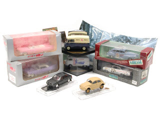 miniatures reproduisant les modèles : CHRYSLER, MORRIS, CHEVROLET, VOLKSWAGEN, LANCIA & CADILLAC - une boîte en état 'c' - on y joint 3 dioramas en carton de la marque