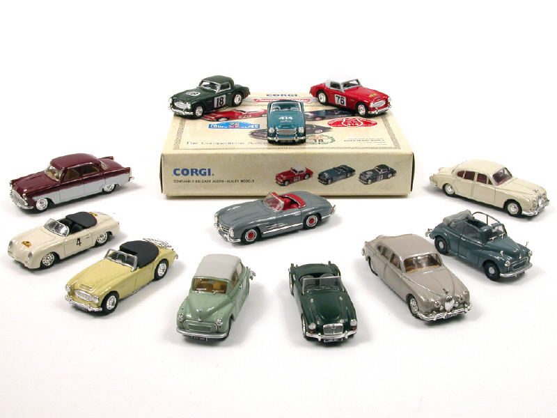 miniatures reproduisant les modèles : MORRIS, AUSTIN HEALEY, FORD, MGA, PORSCHE, JAGUAR & MERCEDES - 3 modèles en coffret - manque les rétroviseurs sur un véhicule