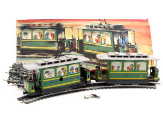 contient : un tramway à 2 éléments dont un avec moteur à clef (fonctionne), un conducteur/receveur, 6 rails courbes, un rail droit & une clef