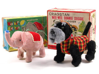 longueur 23,5 cm - moteur à piles (fonctionne) - avec télécommande - en action, le chien avance puis s'arrête pour lever la patte afin de faire ses 'petits besoins' tout en aboyant - ses yeux s'allument - avec bruiteur, bouche à incendie & arbre en carton - cale de boîte