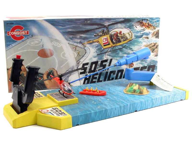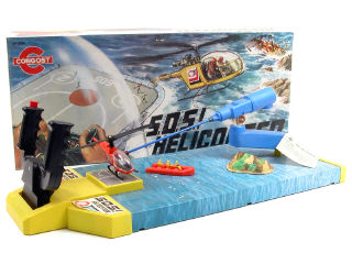 longueur 66 cm - moteur à piles (fonctionne) - l'action des manettes permet de faire évoluer l'hélicoptère afin de récupérer les naufragés dans le canot pneumatique & les déposer sur l'île - avec bon de contrôle