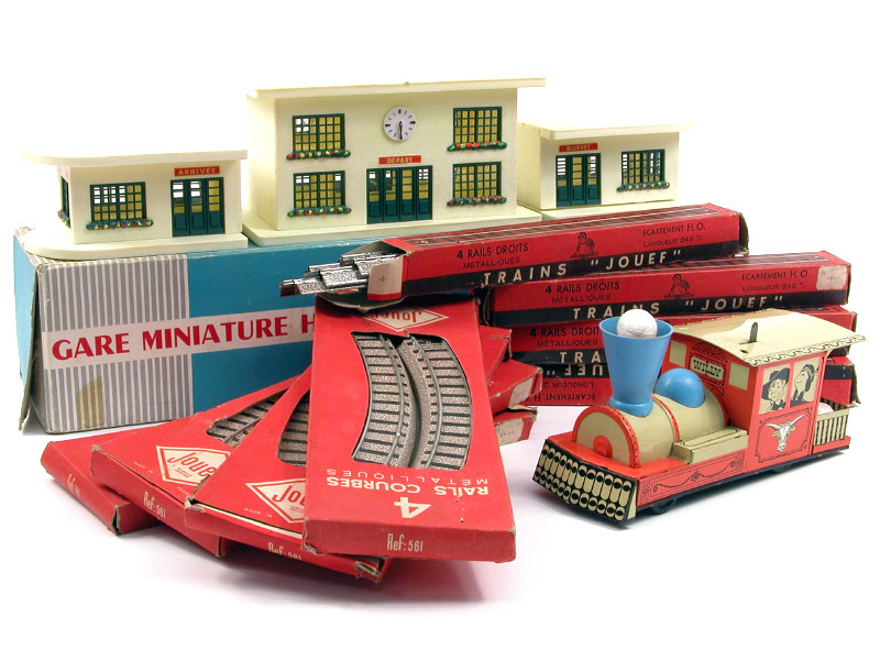 écartement 'HO' - quelques éléments légèrement jaunis - on y joint 8 boîtes de rails droits & courbes en tôle de la marque 'JOUEF'