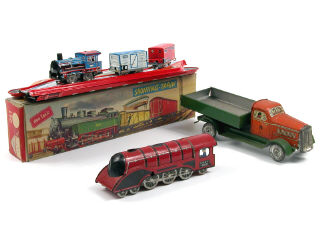 longueur 108 cm - moteur à ressort (fonctionne) - en action, la locomotive & ses 2 wagons simulent une scène de triage ferroviaire