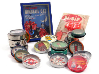 petites traces d'oxydation & quelques petits enfoncements sur différents jeux - on y joint une petite boîte en tôle lithographiée 'PER'LUSTUCRU' & 2 petites figurines, d'un seul tenant, en plastique 'BI-BIP' de la marque BESTSELLERS sous blister jamais ouvert