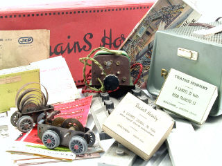 états de 'B' à 'F' - comprend notamment : 3 transformateurs, plusieurs maquettes pour trains 'HO', pièces détachées dont des moteurs à clef de locomotives, un tableau de branchement, 2 boîtes vides dont une de passerelle n°2 & un ensemble de documentations - on y retrouve notamment les marques : HORNBY, ROLTEX, JEP, JOUEF & FALLER