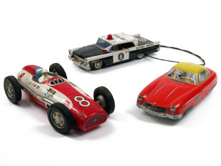 longueur 30,5 cm - moteur à piles (à revoir) - avec conducteur - traces d'oxydation dans le compartiment & sur la trappe des piles - manque un élément de train-avant droit & le saute-vent - volant incomplet - habitacle découpé & transformé partiellement