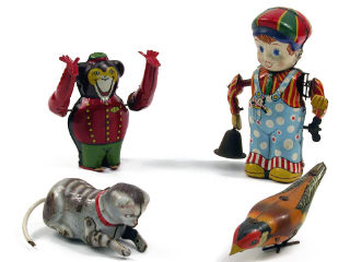 hauteur 15,5 cm - moteur à ressort (à revoir) - en action, le garçonnet agite sa cloche dans sa main droite tout en remuant sa tête & son bras gauche - manque un élément dans la main gauche - petites traces d'oxydation - bras droit désolidarisé de l'épaule