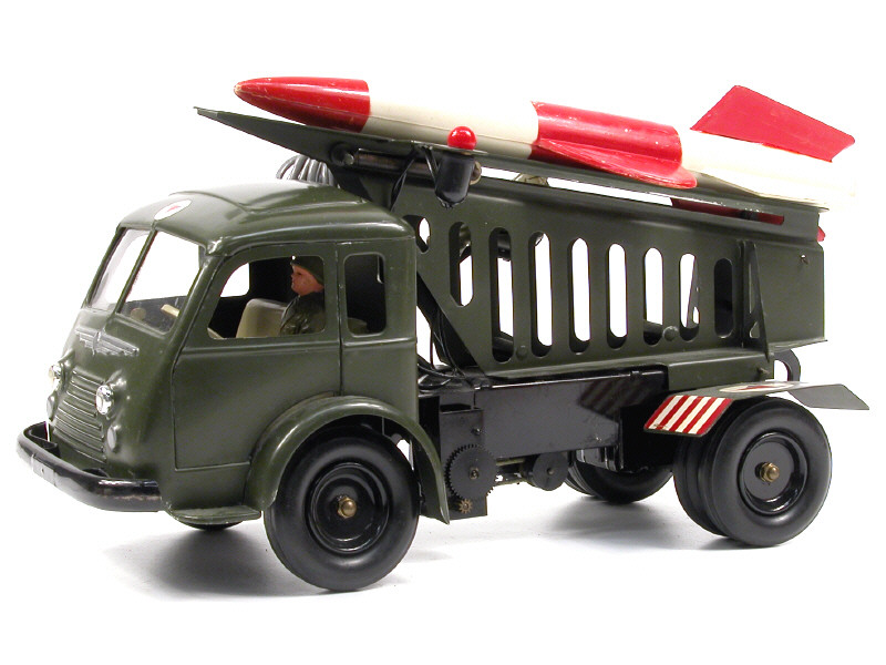longueur 34 cm - moteur à piles (fonctionne partiellement) - la télécommande (incomplète) permet normalement la marche avant & arrière, la direction, la montée & la descente de la rampe de lancement - avec 2 personnages & feu lumineux - ce modèle est habituellement connu avec une cabine SAVIEM JM240 - SUPERBE !