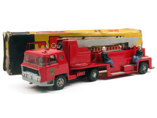 longueur 49 cm - moteur à piles (à tester) - traces d'oxydation sur les parties nickelées - avec 4 pompiers (manque un pied) & une échelle amovible (cassée) - manque gyrophares de toit, échelle amovible & trappe de boîtier de piles
