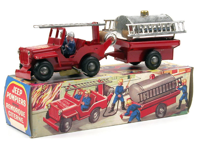 JOYAX (FRANCE) JEEP de pompiers avec remorque-citerne en tôle rouge