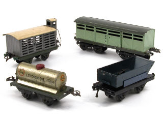 états de 'D' à 'R' - comprend : un wagon à bestiaux, un wagon à lait avec vigie, un wagon-citerne 'ESSO' & un wagon basculant rotatif (très importantes traces d'oxydation)
