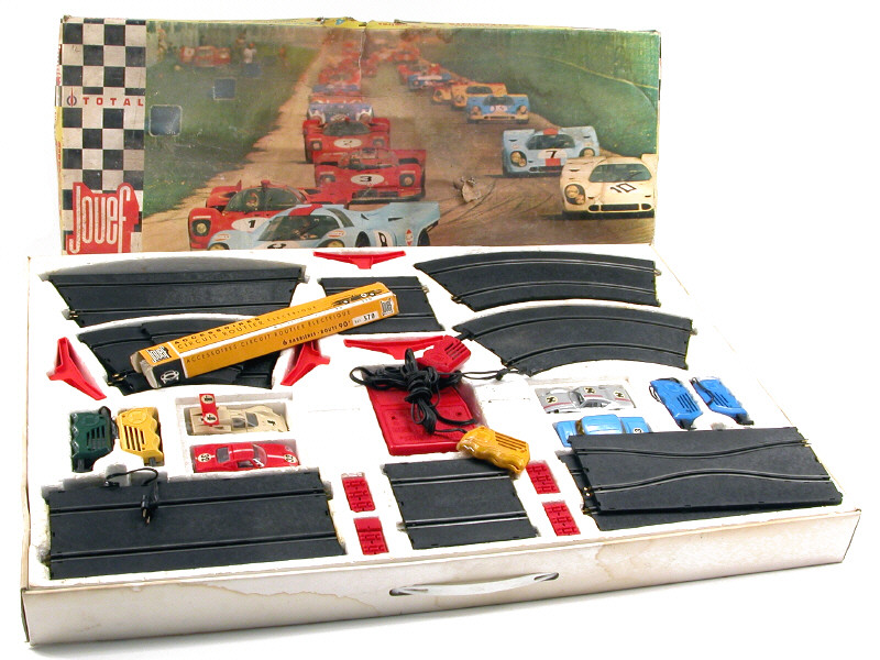 dimensions : 81,5 x 56 cm - contient : une RENAULT 8 GORDINI, une PORSCHE GT (manque un phare), une FORD GT (manque une vis de châssis), une CHAPARRAL 2F, 8 rails courbes, 3 3/4 de rails courbes, 4 demi-rails courbes, 20 rails droits, un demi-rail droit, 2 1/4 de rails courbes, 8 rails courbes de virages relevés, 4 poignées, un transformateur & des accessoires de piste - petites traces d'oxydation sur certaines parties métalliques - on y joint une ALPINE 3000, une CHAPARRAL 2F (manque aileron), 13 rails & 2 poignées