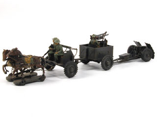 longueur 48 cm - comprend : carriole avec 2 chevaux, 2 personnages en composition, une remorque avec canons de DCA, un personnage en composition & un canon tracté - traces d'oxydation - importante dénaturation des chevaux - avec système de bruiteur - petites parties tordues sur le canon