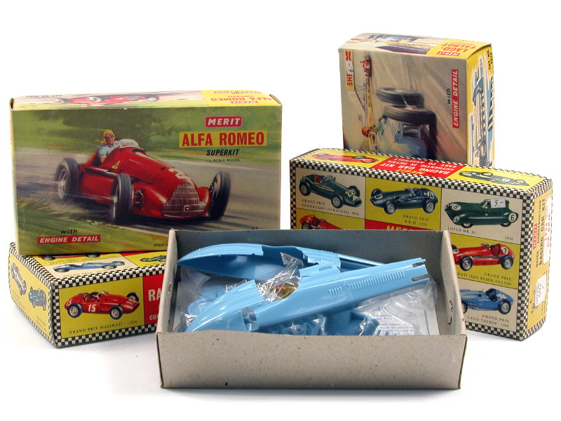 comprend : ALFA ROMEO 158 de 1950, B.R.M. & FERRARI Grand Prix de 1956 ainsi que TALBOT LAGO Grand Prix de 1949 - maquettes non montées - semblent complètes - avec notices & planches de décalques