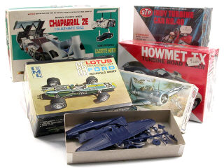 comprend : INDY TURBINE CAR, CHAPARRAL 2E, OLSONITE EAGLE, HOWMET TX, LOTUS 65 & SBD DAUNTLESS - 2 modèles en états 'B' - 3 boîtes en états 'b' - 3 modèles sous film plastique jamais ouvert - on y retrouve les marques : MPC, BANDAI, IMC & AIRFIX
