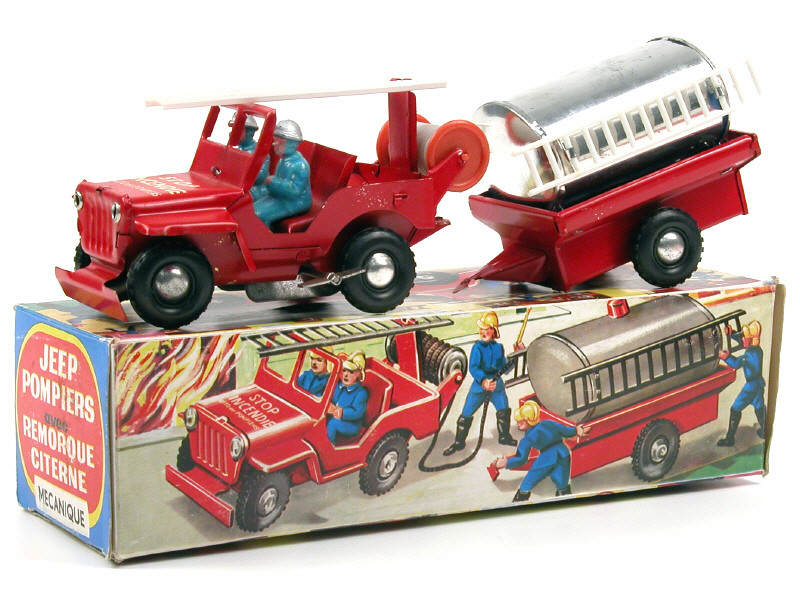 JOYAX (FRANCE) JEEP de pompiers avec remorque-citerne en tôle rouge