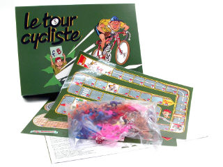 comprend : 2 tapis de jeu, un sachet de cyclistes avec 2 dés, un tableau de scores & une règle du jeu