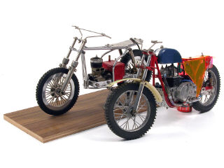 longueur 30,5 cm chacune - petits manques - une des motos est dotée d'un moteur thermique - un modèle sur socle de présentation en bois