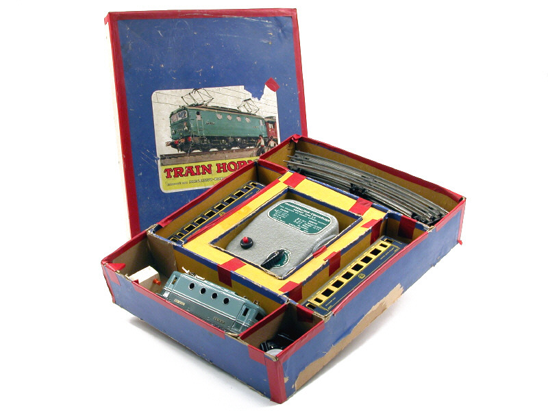 contient : une locomotive électrique BB-8051 (manque un pantographe, une partie de son support, l'ampoule d'éclairage & une boucle d'attelage), une voiture PULLMAN (un axe & 2 roues non d'origine), une voiture-restaurant, un transformateur, 10 rails courbes & un ensemble de broches d'assemblage