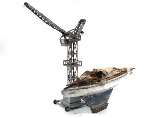 hauteur 57 cm - moteur à clef (non testé) - avec conducteur dans sa cabine - version à 2 étages - manque 2 manivelles & une vitre de cabine - importantes traces d'oxydation