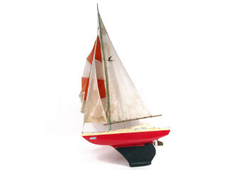longueur 72 cm - moteur à pile (fonctionne) - manque une prise d'air - avec spinnaker - traces d'humidité sur les voiles - petits manques